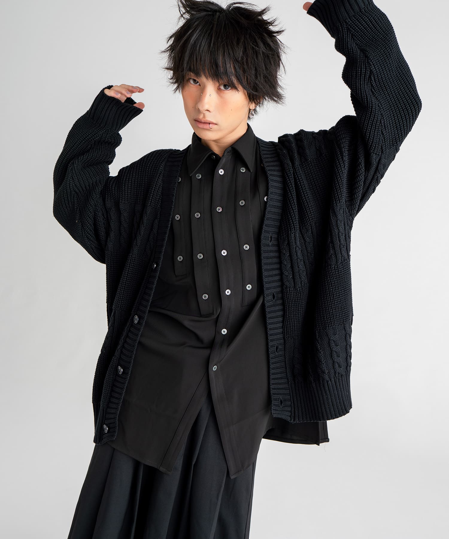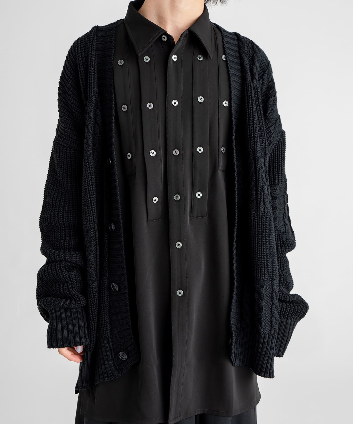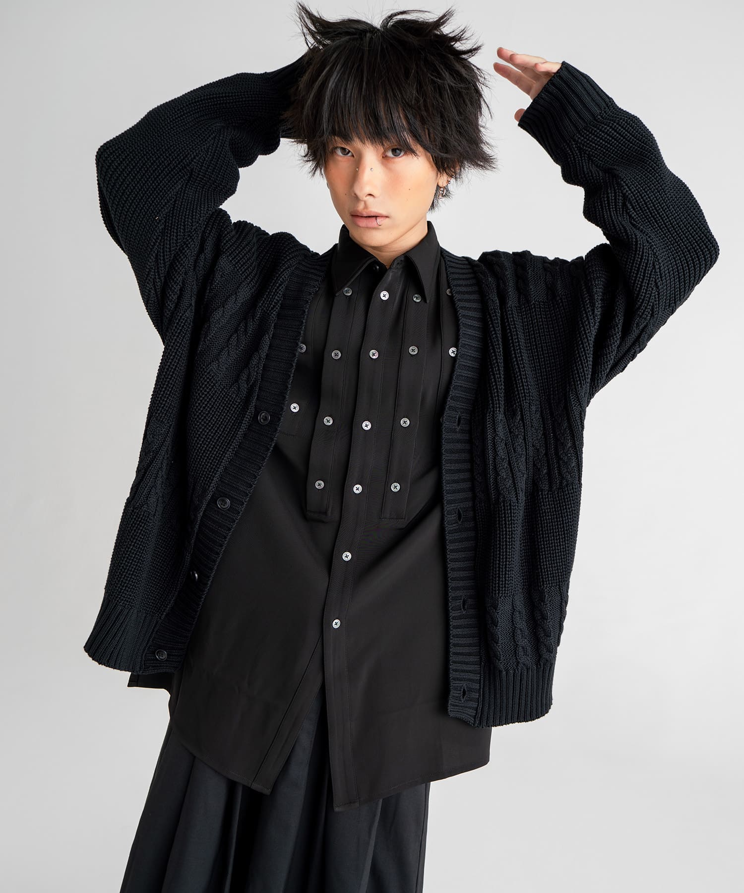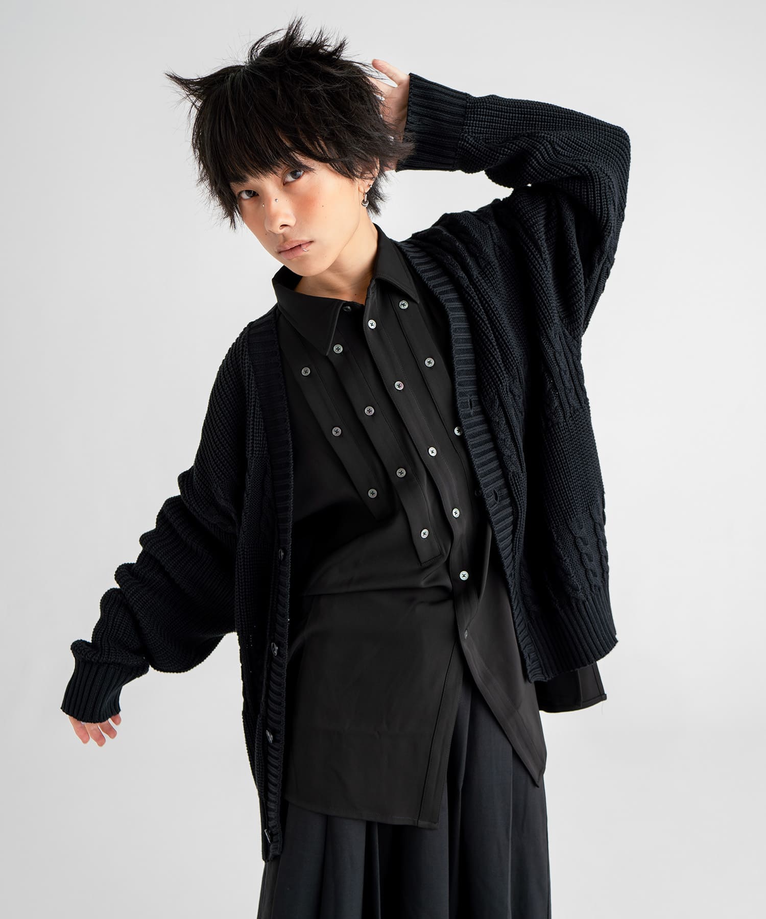 Both the body and sleeves can be opened like a slit when the buttons are undone, making it a versatile piece that can be worn alone or layered.