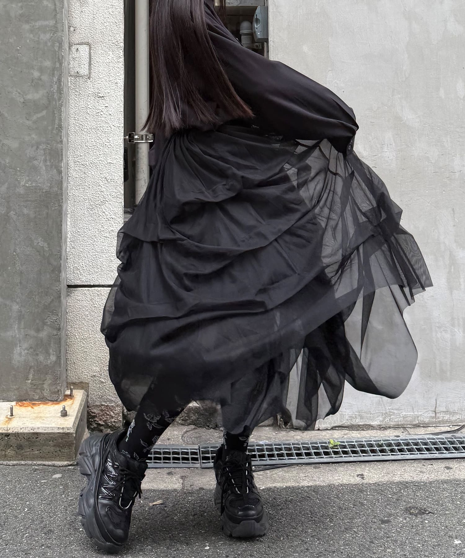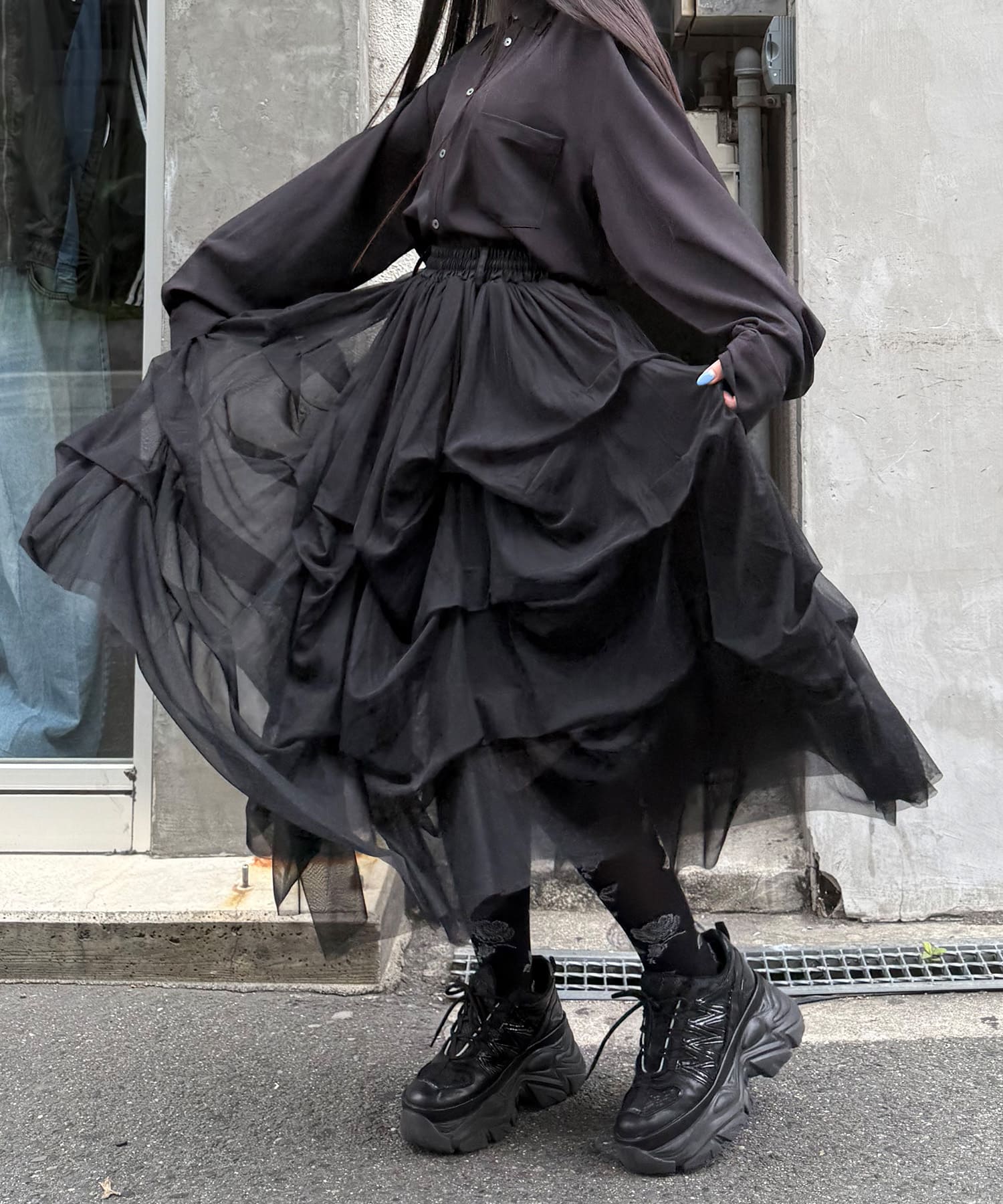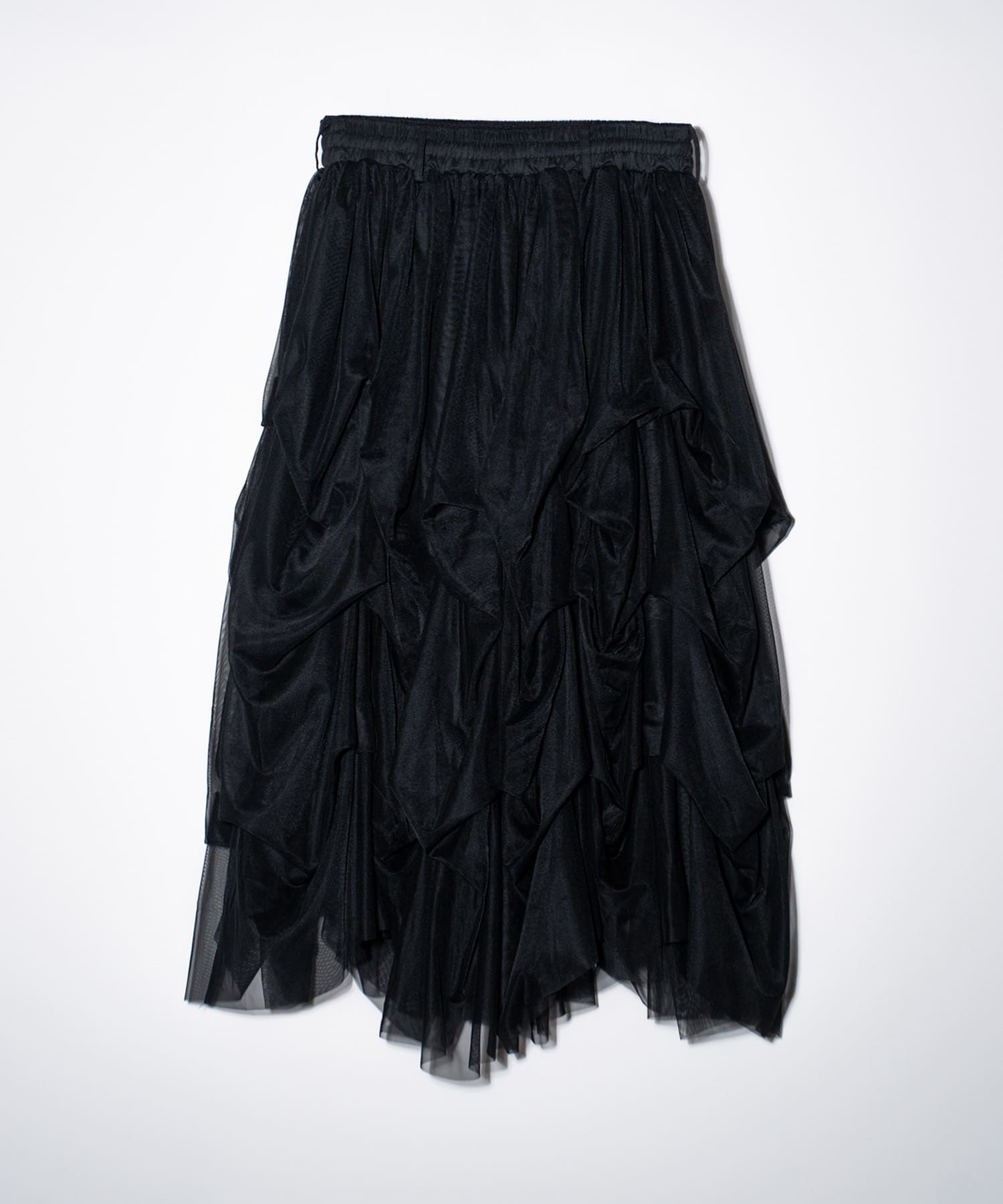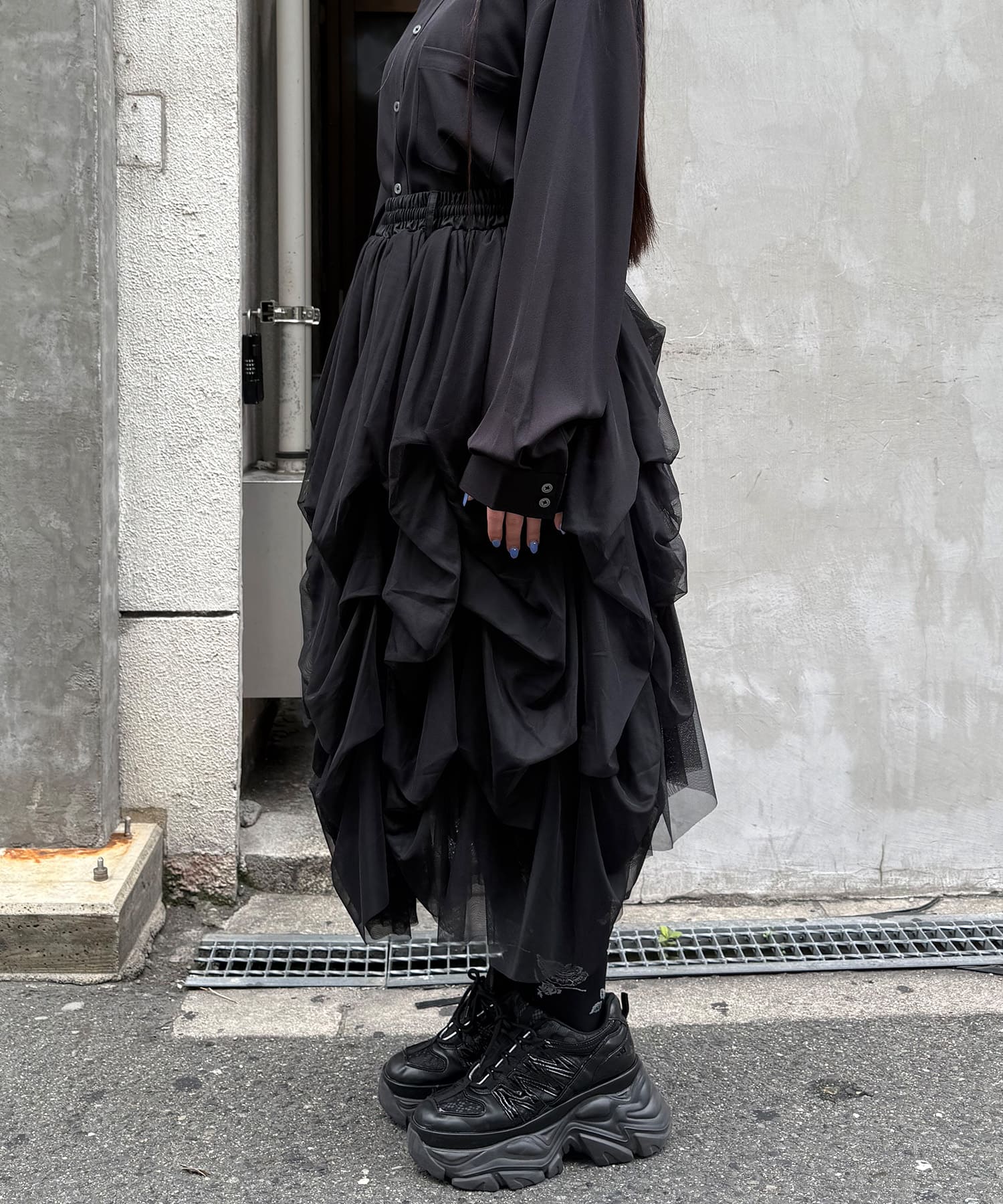透け感のあるチュール生地を使用したボリュームタックチュールスカート。